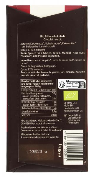 Dla wszystkich miłośników gorzkiej czekolady: zawartość kakao wynosząca 87 procent i delikatne rozpuszczanie czekolady sprawiają, że Alnatura Edelbitter-Schokolade jest prawdziwym przysmakiem. Wszystkie składniki pochodzą z rolnictwa ekologicznego, a podczas produkcji nie stosuje się lecytyny. Receptura jest wegańska.