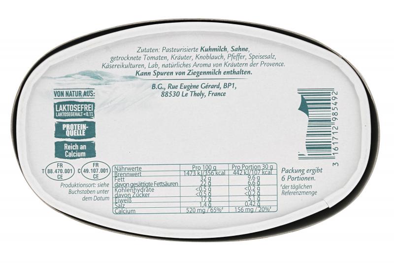 Pasteryzowane MLEKO KROWIE, ŚMIETANA, suszone pomidory, zioła, czosnek, pieprz, sól, kultury serowe, podpuszczka, naturalny aromat ziół prowansalskich. Może zawierać śladowe ilości MLEKA KOZIEGO.