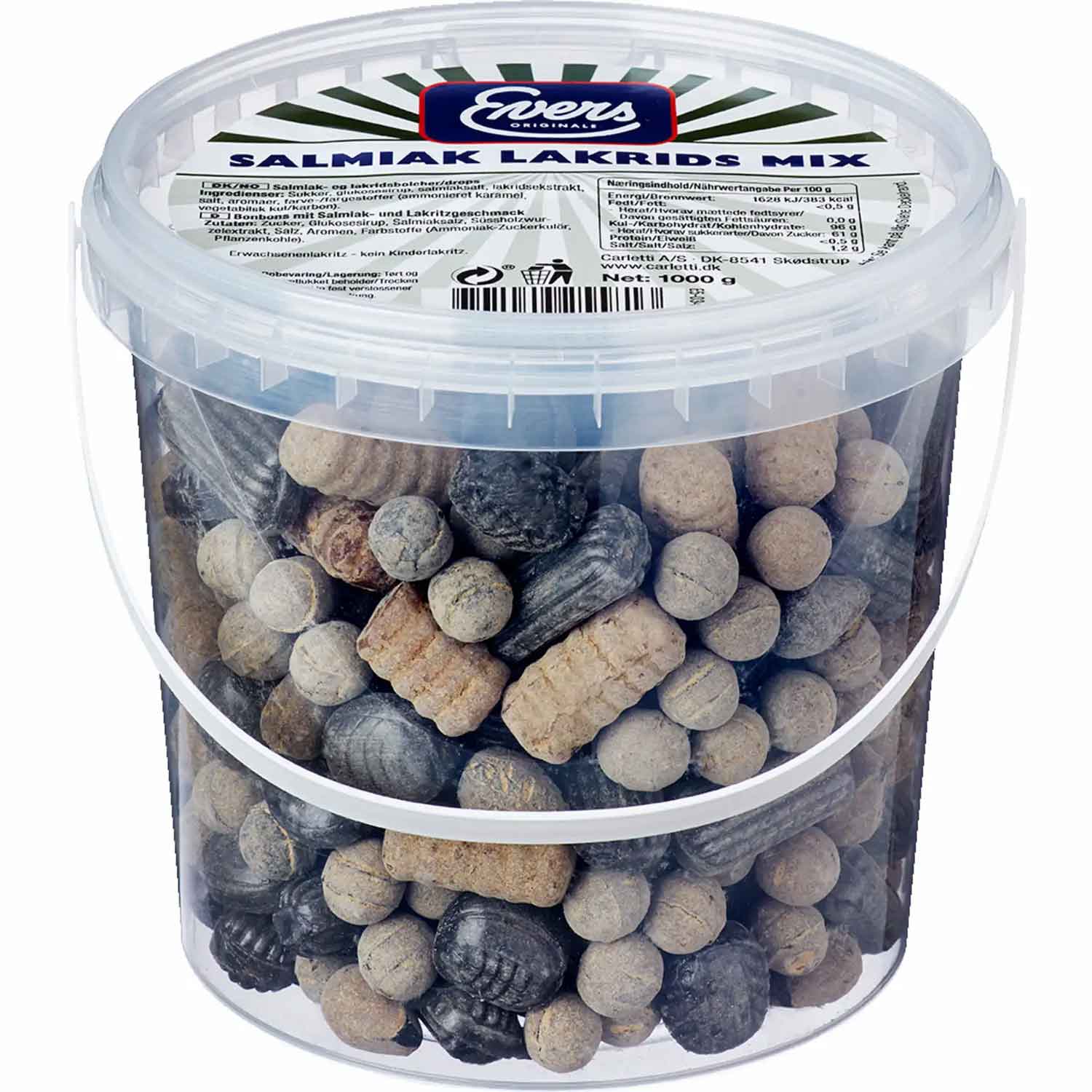 Mieszanka najwyższej jakości. Z Evers Salmiak Lakrids Mix w dużym wiadrze o pojemności 1,5 kg prawdziwi fani lakieru mogą doświadczyć prawdziwych chwil szczęścia. W wytrzymałym wiadrze z praktycznym uchwytem znajduje się pyszna mieszanka najlepszych twardych odmian lakieru od Evers. Cukierki, pałeczki, rolki i kule czekają tylko na to, aby zasmakować wspaniałych aromatów i zadowolić podniebienie. Słona wypełnienie z solą amonową zapewnia intensywne chwile rozkoszy. Projekt produktu może różnić się od przedstawionego na zdjęciu.