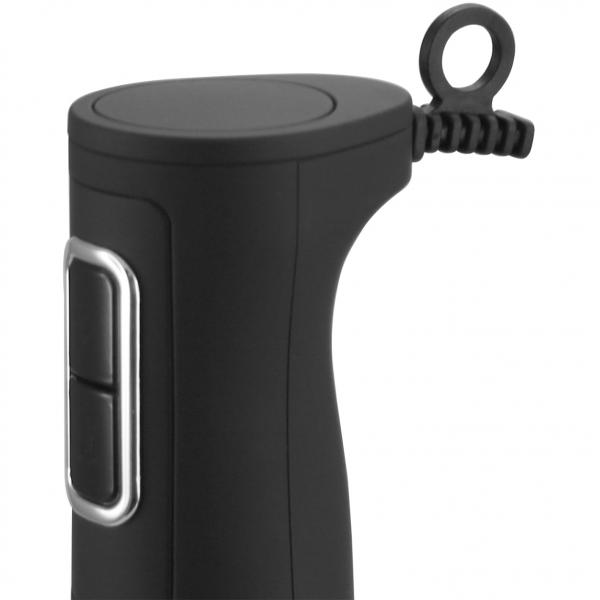 2 prędkości, odłączany pręt miksujący, pręt ze stali nierdzewnej, 2 ostrza ze stali nierdzewnej, pętla do zawieszenia, obudowa z gumy, materiał kontaktowy z żywnością wolny od BPA.