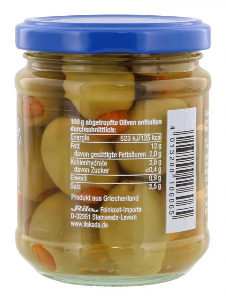 Ręcznie zbierane oliwki, bez pestek i starannie wypełnione pastą paprykową.