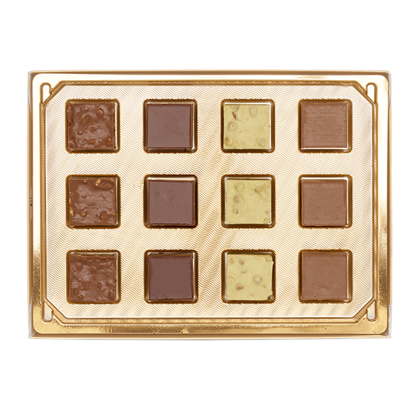 Zawartość opakowania Ten produkt zawiera: 3 praliny z nugatem z orzechami laskowymi, 3 praliny z nugatem z pistacjami, 3 praliny z nugatem czekoladowo-orzechowymi, 3 praliny z nugatem migdałowo-orzechowymi.