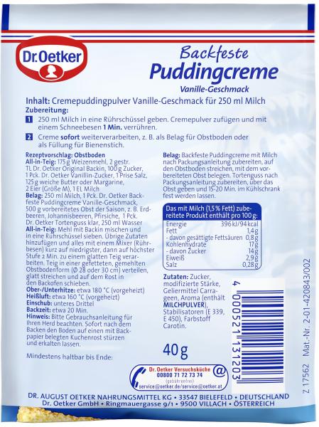 Szybkie i pewne w przygotowaniu jest Dr. Oetker Backfeste Puddingcreme o smaku waniliowym. Idealnie nadaje się do nadziewania ciasteczek pszczelich, ciast owocowych, ciast masłowych i innych wypieków. Osoby uwielbiające pudding na pewno pokochają tę Puddingcreme, która jest przygotowywana bez gotowania i może być pieczona razem z ciastem. Dr. Oetker Backfeste Puddingcreme wymieszać z 250 ml mleka przez 1 minutę i można ją od razu dalej przetwarzać.