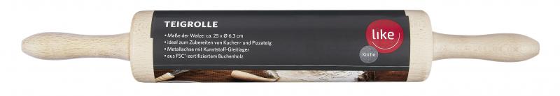 Wałek do ciasta wykonany z certyfikowanego drewna bukowego FSC®, o wymiarach 25 x Ø 6,3 cm, z metalową osią i łożyskiem z tworzywa sztucznego.