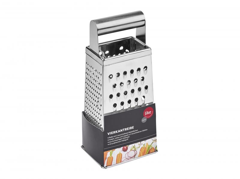Reibe z 4 różnymi powierzchniami do ścierania – szatkowanie, ścieranie i tarkowanie w 2 różnych grubościach, wielofunkcyjna jako tarka do parmezanu, sera, warzyw i ziemniaków, idealna również do owoców, orzechów, gałki muszkatołowej, czekolady i innych, wykonana z wysokiej jakości stali nierdzewnej, z praktycznym uchwytem, około 24 cm wysokości.