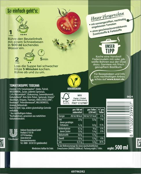 Intensywny smak pomidorów w połączeniu z pysznymi włoskimi ziołami – to sprawia, że zupa pomidorowa toskańska jest niezwykle charakterystyczna. Zupy Knorr Feinschmecker: z dbałością o dobrze wybrane składniki i dodatkowo dużymi kawałkami warzyw dla aromatycznego smaku.
